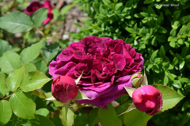 jako odporne na choroby, przemarzanie i wszelkiego rodzaju kłopoty. Moje purpury rosną w towarzystwie hortensji, bukszpanów, traw, cleome i naparstnic. W przyszłym roku zamierzam posadzić w ich pobliżu dużą ilość przetaczników, które wydają się idealnie podkreślać urodę róż.